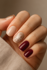 On short nails, matte nails are also the trend ,and they look exceedingly stylish. The dark color, such as a matte black, deep burgundy, or matte nud,e iahe sophisticated and subtle style. It is also possible to add a bit of a shiny polish to one accent nail that will help to form a potentially interesting contrast and make your nails look more distinctive.